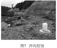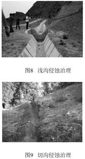溝蝕易造成管道上方覆土嚴重流失, 嚴重情況下將造成管道和光纜裸露, 目前主要治理措施是坡面修建土質(zhì)簡(jiǎn)易排水渠或者漿砌石排水系統。 加強坡面排水是防止溝蝕最有效的措施。 如圖8、 9是切溝侵蝕治理。