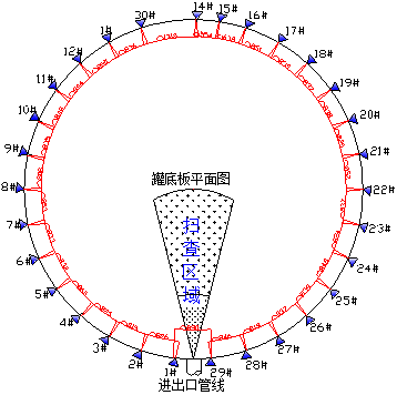 以某10萬(wàn)方儲罐底板導波檢測為例,該儲罐共設置導波檢測點(diǎn)30個(gè),檢測點(diǎn)平均長(cháng)度約為1000mm,寬度約為100mm,檢測點(diǎn)分布如圖14所示。