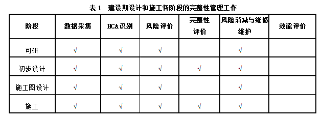 管道設計、施工階段均包括數據采集、高后果區識別(HCA)、風(fēng)險評價(jià)、完整性評價(jià)和風(fēng)險消減與維修維護等內容(見(jiàn)表1),其中影響管道安全運行和完整性管理的關(guān)鍵問(wèn)題,應重點(diǎn)關(guān)注。