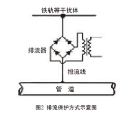 治理已運行軌道交通系統存在的雜散電流, 需要在管道的合適位置引入排流裝置(如圖2所示)。這種做法盡管不如通過(guò)整改軌道交通供電回路的措施那樣經(jīng)濟有效,但在受技術(shù)和條塊分隔的行業(yè)壁壘等因素限制的情況下,不失為一種有效的減輕電性干擾危害、保護地下管道等金屬構筑物安全的選擇。
