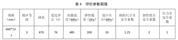 參考現有的管材技術(shù)條件和運行工況,其中夏比沖擊功參考Q/SY XQ4-2003《西氣東輸管道工程焊接施工及驗收規范》,取平均值76J,評價(jià)參數詳見(jiàn)表4。