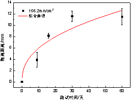根據建立的陰極剝離預期壽命模型,可以獲得不同電流密度下防腐層剝離距離達到一定值時(shí)的壽命特征(即時(shí)間),在實(shí)際海管陰極保護設計時(shí),可參考此方法,以高電流密度下的壽命特征外推獲得低電流密度下的壽命特征。