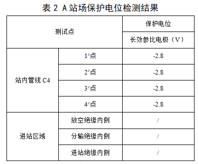 從表1、表2可以看出,進(jìn)站區域絕緣接頭內側保護電位達不到要求,站內區域陰保保護電位偏負,遂對恒電位儀進(jìn)行了調整。調整后經(jīng)測試,恒電位儀運行正常,站內區域保護電位有較大正向偏移,但進(jìn)站區域絕緣接頭內側保護電位較之前無(wú)明顯變化,達不到保護要求,而且啟/停恒電位儀,都沒(méi)有明顯變化,說(shuō)明該區域無(wú)陰保電流。當恒電位儀控制電位為–1.8V時(shí),進(jìn)站區域處于欠保護狀態(tài),而其他區域處于過(guò)保護狀態(tài),說(shuō)明調整恒電位儀的輸出對該區域的保護沒(méi)有起到作用。