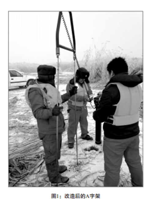檢測前,先采用電鉆鉆透冰層(見(jiàn)圖2),然后將加長(cháng)后A字架通過(guò)鉆孔插入至管道上方淤泥中(見(jiàn)圖3),接收發(fā)射機施加于管道上的檢測信號。