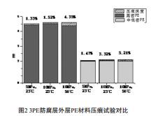 通過(guò)開(kāi)展模擬防腐層外層PE材料在土壤環(huán)境中可能遭受的植物根系生長(cháng)發(fā)育生產(chǎn)的頂壓狀況,進(jìn)行的壓痕試驗測試結果證明:在溫度達23℃時(shí),5MPa頂推壓力對PE防腐層產(chǎn)生不足2%的壓深比,10MPa頂推壓力對PE防腐層的最大壓深比為3.32%;50℃時(shí),10MPa的實(shí)驗條件下,PE材料防腐層的壓深比也僅為5%左右。