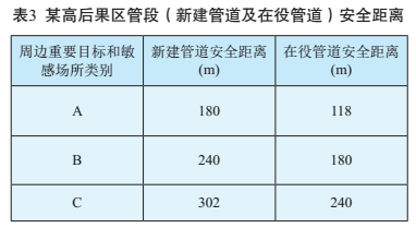 從上表可以看出,確定的安全距離值相比現有標準規范給定的值大很多。這主要是由于管道風(fēng)險可接受標準參考;袠I(yè)確定,對管道行業(yè)來(lái)講,可能過(guò)于嚴格。此外,目前設定的管道中心線(xiàn)兩側各5m的距離,普遍認為保證不了管道周邊的人員安全,其設定的初衷只是為了方便事故后的搶險入場(chǎng)。國內多處管道改線(xiàn)案例也證明了這一點(diǎn):在管道穿過(guò)市鎮的區段,管道兩側雖保證了5m的距離,但由于周邊人口太過(guò)密集,管道企業(yè)與民眾都覺(jué)得風(fēng)險過(guò)高。最后管道企業(yè)進(jìn)行了改線(xiàn),將管道遷出了該區域。