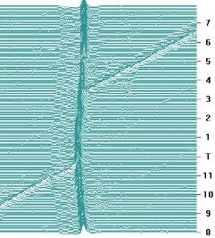 目前,國內大口徑長(cháng)輸管道干線(xiàn)基本采用螺旋焊縫埋弧焊管道,經(jīng)內檢測后可以清晰地看到螺旋焊縫和環(huán)焊縫信號(圖1)。內檢測缺陷定位時(shí),通常先開(kāi)挖參考環(huán)焊縫(也就是距離缺陷點(diǎn)最近的上游或者下游的環(huán)焊縫),通過(guò)螺旋焊縫與環(huán)焊縫的交角來(lái)判定開(kāi)挖的參考環(huán)焊縫是否準確,缺陷定位開(kāi)挖較方便。