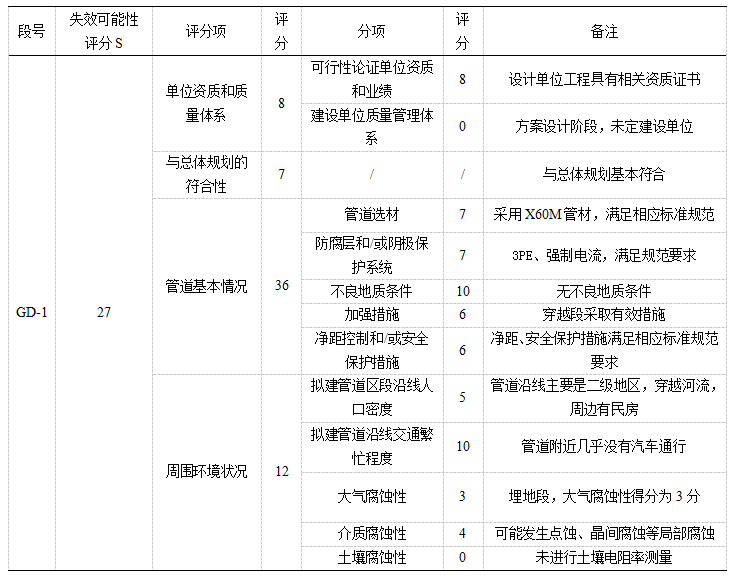 根據前文提出的改線(xiàn)管段風(fēng)險評估方法,改線(xiàn)管段GD-1的失效可能性評分如表2所示。