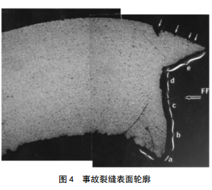 掃描電鏡檢查出5個(gè)明顯的裂縫區。圖 4給出了事故裂縫表面輪廓:(a)起始于管道的內表面,表明腐蝕疲勞所引起的裂紋;(b)(c)(d)分別表示裂縫輻射面從管道表面45度變?yōu)閹缀醮怪,表明拉應力和疲勞擴展,無(wú)明顯腐蝕;(e)表明裂紋擴展成為45度的剪切面。管道外表面鄰近的最終開(kāi)裂區呈蜂窩狀,主要是延性過(guò)應力裂紋。