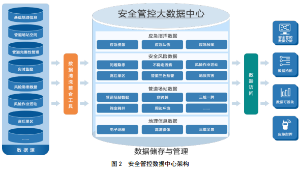 根據管道完整性管理數據采集與整合、高后果區識別、風(fēng)險評價(jià)、完整性評價(jià)、風(fēng)險消減與維修維護、效能評價(jià)等六步循環(huán)[3]流程,基于川西北氣礦現有的硬件設備、網(wǎng)絡(luò )、視頻監控、生產(chǎn)調度中心[4]等基礎支撐環(huán)境,以三維地理信息為載體[5],全面梳理、整合、提取相關(guān)數據源,定期更新重點(diǎn)監控區域 的高清影像、視頻、圖片和360°全景[6] 數據,以統一的“時(shí)間—空間—屬性”組織數據,建立大數據中心,實(shí)現安全管控數據分析、數據挖掘[7]、數據可視化、應急指揮等(圖 2)。