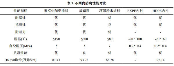 (3)內防腐選擇。不同內防腐特性對比見(jiàn)表 3。
