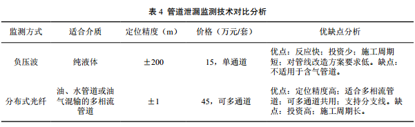 管線(xiàn)首末端處均設置電動(dòng)快速切斷閥,可實(shí)現遠程關(guān)斷。輸油管道泄漏監測技術(shù)與快速切斷閥聯(lián)動(dòng),為快速定位、緊急關(guān)斷和應急搶修提供自控手段。目前常用的分布式光纖監測技術(shù)和負壓波監測技術(shù)見(jiàn)表 4。
