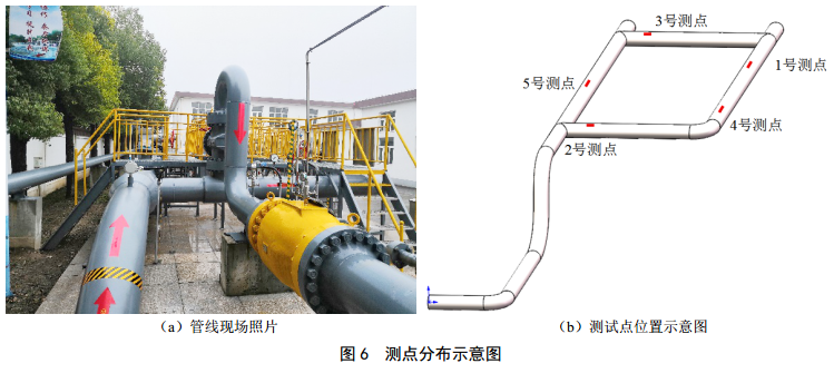 第四階段:輸油工況下,待充分釋放應力后(48小時(shí)),回填埋地管道,保留部分支撐并重新擰緊螺栓,測量1、 2、 3、 4號測點(diǎn)應力水平,再次增加5號測點(diǎn)作為補充。