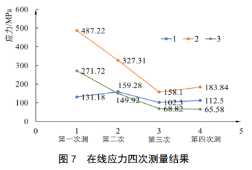 表 2為所有測量點(diǎn)的四次應力測量結果,圖 7 為1、 2、 3號測點(diǎn)四次測量結果變化曲線(xiàn)。從結果可知: 1號測點(diǎn)應力值始終在安全范圍內,變化范圍不大; 2號測點(diǎn)應力值變化最大,第一次測量結果明顯 高于其他測點(diǎn),并且已達到了屈服應力,經(jīng)過(guò)應力釋放后應力水平有所下降,再一次支撐釋放應力,應力數值進(jìn)一步減小,修復后應力有很小增加,但都滿(mǎn)足強度要求; 3號測點(diǎn)應力變化規律與2號點(diǎn)類(lèi)似,經(jīng)過(guò)開(kāi)挖后應力得到釋放,修復后滿(mǎn)足強度要求; 4號測點(diǎn)位于靠近彎頭的位置,應力值較小且變化不大; 5號測點(diǎn)是修復后的補充測點(diǎn),其應力值在安全范圍內。