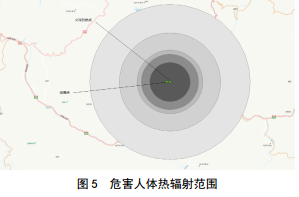 設200 s時(shí),出現一處引燃點(diǎn)引燃混合氣團變成火球,假設泄漏的天然氣全部參與形成火球,由于噴射火的危害主要是熱輻射,故參照熱通量傷害準則表 2,運行火球模型,影響人體熱輻射范圍如圖 5所示。