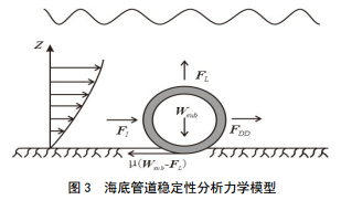 直接鋪設在海床上的管線(xiàn),由于受到環(huán)境水動(dòng)力載荷作用,導致管道產(chǎn)生豎向或側向移動(dòng)。圖 3為海底管道穩定性分析受力模型,環(huán)境載荷包括作用于管道的水動(dòng)力載荷(拖曳力、升力和慣性力)、管道沉降產(chǎn)生的側阻力。