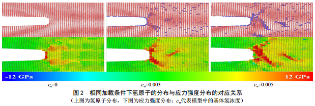引入氫原子后,裂紋前端的應力增大,應力集中區域也在氫濃度增加后由裂紋兩端擴展至整個(gè)裂紋前端,這客觀(guān)上增加了整個(gè)裂紋前端微觀(guān)裂紋萌生的可能。圖 2為應力強度為1.34 MPa·m0.5時(shí),裂紋前端氫原子濃度和應力的對應關(guān)系。