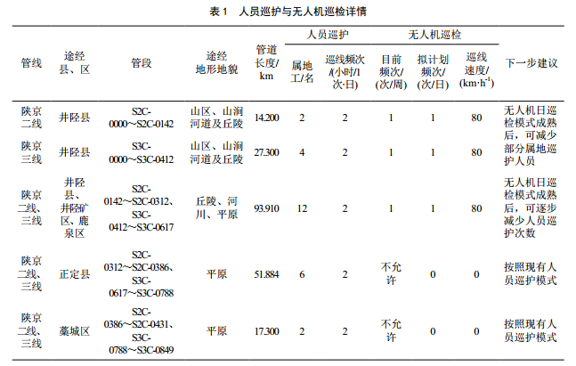 在允許周飛檢條件下,無(wú)人機巡檢的翻山、丘陵段,人工巡檢頻次可調整為每半月1次,增加巡線(xiàn)工管道基礎設施維護、問(wèn)題處理時(shí)間。巡護業(yè)務(wù)外包公司保持每周1次巡檢、檢查,增加每周對無(wú)人機巡檢發(fā)現問(wèn)題及時(shí)確認處理的工作內容。