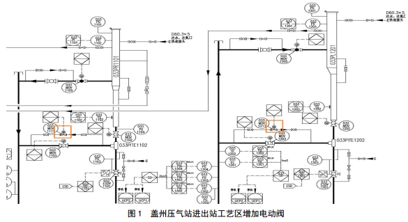 將進(jìn)/出站旁通管線(xiàn)上的平衡閥改為電動(dòng)并接入站控系統(圖 1),以改變以往在停站后干線(xiàn)與站內壓差過(guò)大時(shí)只能依靠人工去緩慢平衡壓力的狀況,使壓差平衡過(guò)程可控,從而實(shí)現一鍵啟站時(shí)能夠自動(dòng)導通工藝流程。