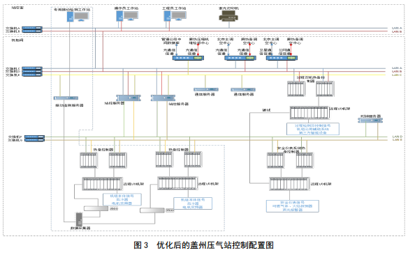 蓋州壓氣站將負荷分配PLC整合入站控PLC、整合壓縮機控制系統的過(guò)程控制及安全儀表部分,最終全站只設有站控過(guò)程控制PLC、站控安全儀表PLC、兩套壓縮機控制系統PLC共4套(圖 3),數量降低了50%。同時(shí)將控制系統網(wǎng)絡(luò )分為控制網(wǎng)和設備網(wǎng),控制網(wǎng)用來(lái)傳輸北京油氣調控中心、站控系統HMI與站場(chǎng)過(guò)程控制系統PLC通訊數據,設備網(wǎng)用來(lái)傳輸各系統控制器之間的交換數據,保障了數據傳輸帶寬,并采用國產(chǎn)PLC可在設備網(wǎng)使用UCP協(xié)議,通訊速率達到108 Mbps。