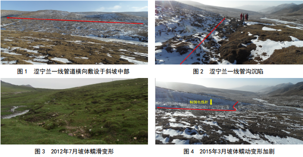 澀寧蘭一線(xiàn)K687+600處管道橫向敷設于斜坡中上部,除管溝發(fā)生沉陷外(最大沉陷深度近1 m),坡體垂直于管道方向發(fā)生了蠕動(dòng)變形。 2015年3月,現場(chǎng)調查滑坡后緣電線(xiàn)桿明顯向下坡方向傾倒,管道附近土體向下坡方向推移了2~3 m。與2012年7月現場(chǎng)調查相比,變形進(jìn)一步加劇,并對臨近的澀寧蘭復線(xiàn)管道的安全運營(yíng)構成嚴重威脅。詳情如圖 1―4所示。