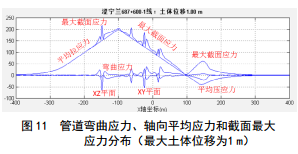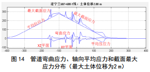 如圖 10所示為管道應力分布。管道為大長(cháng)細比結構,其受力與變形可分解為水平彎曲、豎向彎曲、軸向拉伸(或壓縮)及扭轉變形的組合。由于管道在 側向土體推移作用下主要承受拉(壓)彎組合變形,扭轉作用較弱。因此,計算結果不討論管道軸向扭轉應力的影響。管道應力由水平彎曲應力、豎向彎曲應力、軸向平均拉伸(或壓縮)應力疊加得到。如圖 11所示,管道在X<100 m區段主要承受拉彎變形,而在X>100 m區段則承受壓變變形,這是由管道走向特征和土體位移分布特征決定的。