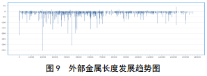 長(cháng)度發(fā)展趨勢: 2015年缺陷的內/外金屬腐蝕長(cháng)度普遍比2011年缺陷小,且存在降幅較大缺陷,只有少量缺陷的長(cháng)度為正增長(cháng)(圖 8、圖 9),長(cháng)度差統計如表 7所示。
