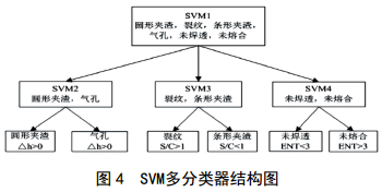 分類(lèi)器構造即在整體結構中,先將相似量作為一類(lèi),然后根據相似量之間的細微變化,再通過(guò)模型算法進(jìn)行區分。管道建設期和運行期焊縫中存在的裂紋、夾渣、氣孔、弧坑、未焊透、未熔合、咬邊等缺陷,不同缺陷的灰度差∆h、等效面積S/C、圓形度e、熵ENT、對比度CON等相關(guān)度等參數不盡相同,利用這些特征參數建立SVM多分類(lèi)(圖 3、圖 4)。