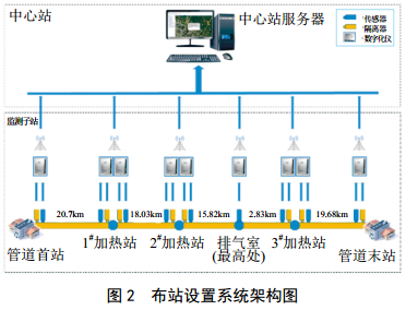 在某油田輸油管道(中間設置加熱站3座)安裝一套S-image次聲波管道泄漏監測系統,由中心主站、監測子站兩部分組成,五個(gè)監測子站即管道首站-1#加熱站-2#加熱站-55公里處排氣室-3#加熱站-管道末站。布站設置系統架構見(jiàn)圖 2。
