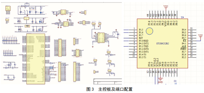 采用PCB板集成控制模塊,設計控制系統主控電路單片機控制端口。通用I/O 口(32 個(gè)),復位后P1/P2/P3 是準雙向口/弱上拉; P0口是漏極開(kāi)路輸出,作為總線(xiàn)擴展用時(shí)不用加上拉電阻;作為 I/O 口用時(shí),需加上拉電阻。 ISP(在系統可編程) /IAP(在應用可編程),可通過(guò)串口(RxD/P3.0, TxD/P3.1)直接下載用戶(hù)程序,數秒即可完成。 3 個(gè)16 位定時(shí)器/計數器,即定時(shí)器T0、 T1、 T2,端口配置(藍色為使用端口)、主控電路及單片機配置如圖 3所示。