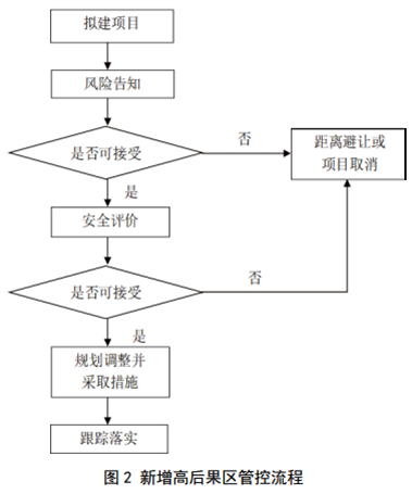 根據138號文“管好存量,嚴控增量”要求,企業(yè)主動(dòng)走訪(fǎng)地方規劃、國土等部門(mén),收集管道周邊建設規劃信息,履行風(fēng)險告知義務(wù)。 2019年,共向各級地方政府、職能部門(mén)(區縣級發(fā)改委、規劃局、應急管理局等)及建設單位發(fā)送高后果區風(fēng)險告知函181份,參與協(xié)調70余次,通過(guò)高后果區風(fēng)險定量評價(jià),在地方接受風(fēng)險告知后調整規劃,“阻止”了新增高后果區41段,明顯遏制了高后果區增量及風(fēng)險等級升高的勢頭。新增高后果區管控流程如圖 2所示。
