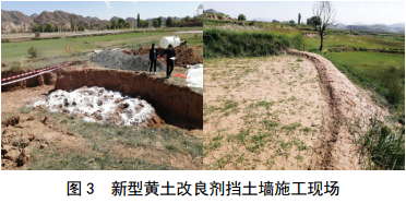 蘭州分公司在蘭鄭長(cháng)成品油管道K9+480米處以抗疏力改良黃土夯筑擋土墻,經(jīng)凍融和汛期考驗,未出現垮塌和沖刷現象,且植被恢復效果較佳(圖 2)。進(jìn)一步優(yōu)化方案后,在蘭成原油管道K47+900米處開(kāi)展了新型黃土改良劑擋土墻嘗試,表明其不影響農作物生長(cháng),施工快捷,具有很好的推廣和應用價(jià)值(圖 3)。