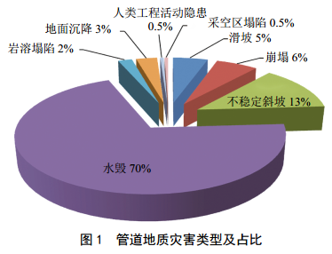 根據2020年分公司開(kāi)展汛前地災普查和汛期巡查工作成果,管道沿線(xiàn)各類(lèi)地災隱患的類(lèi)型及占比見(jiàn)圖 1。