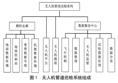 基于測控走廊的無(wú)人機管道巡檢系統組成見(jiàn)圖 1。系統主要由無(wú)人機測控網(wǎng)、無(wú)人機載荷和軟件平臺組成,無(wú)人機測控網(wǎng)包括機載數據終端、地面數據終端和光纖寬帶,軟件平臺包括飛行管理、數據管理、無(wú)人機監控、圖像處理等。