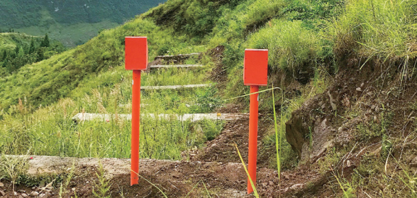 受災段管道安裝3組管道軸向應力監測截面(X1、X2、X3)、2套管道地質(zhì)災害野外監測樁(圖 6,用于數據回傳),其中 X1監測截面在23和24道擋墻之間,X2在18和19道擋墻之間變形最為強烈位置,X3在15和16道擋墻之間。如圖 7所示。