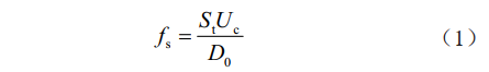 式中fs為渦流釋放頻率,Hz;St為斯托勞哈爾(Strouhal)數;Uc為流經(jīng)管道中心位置的潮流速度(假定為穩定流或恒流),m/s;Do為管道外徑,m。流動(dòng)雷諾數Re由式(2)表示: