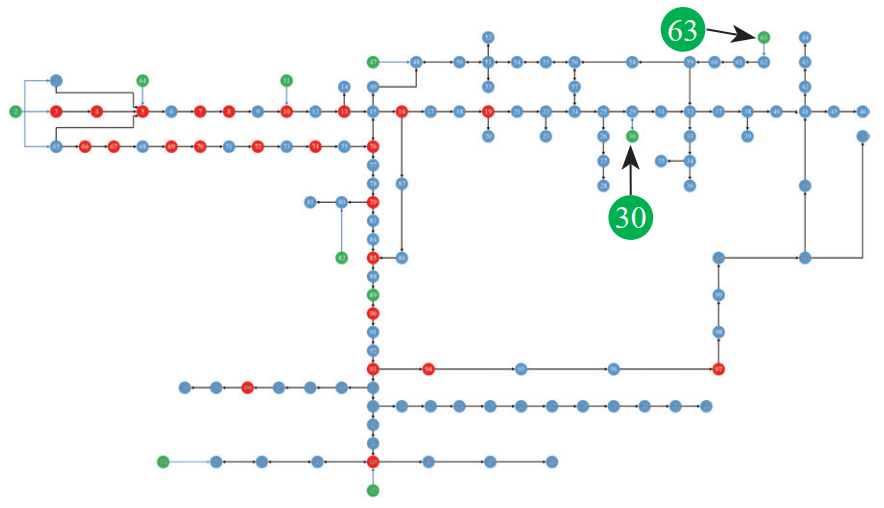 本文通過(guò)對某天然氣管網(wǎng)供氣可靠性進(jìn)行實(shí)例計算,對本方法的可行性進(jìn)行驗證。該管網(wǎng)有138條管道,24個(gè)壓縮站(紅色點(diǎn)表示)和10個(gè)氣源(綠色點(diǎn)表示),拓撲結構如圖 2所示。其中節點(diǎn)63和30分別表示LNG接收站和地下儲氣庫。