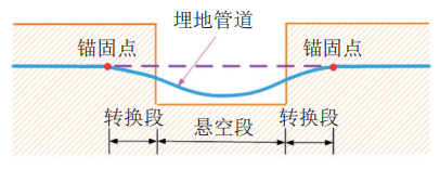 管道一旦形成懸空(圖 1(a)),則難以利用Winkler模型獲得管道力學(xué)響應的分析解答,但是仍然可以根據管—土相互作用的基本原理,考察懸空管道的力學(xué)行為。假設管道非懸空部分仍為彈性地基上的無(wú)限長(cháng)梁,在懸空段由于土體支撐作用的喪失,管道在自重作用下發(fā)生向下的撓曲變形,撓度在懸空段中點(diǎn)達到最大。隨著(zhù)位置向兩側土體趨近,管道撓曲變形逐漸減小。當管道由懸空段進(jìn)入兩側土體后,土體仍然向管道提供約束作用,撓曲變形進(jìn)一步減小,但是由于變形協(xié)調,其變形的方向將發(fā)生變化,并且隨著(zhù)位置逐漸遠離懸空段,反方向的撓曲變形先增加后減小,直至消失,在變形消失處形成了兩個(gè)“錨固點(diǎn)”,我們將懸空段兩側坡肩至錨固點(diǎn)的范圍定義為“轉換段”。在轉換段內,土體仍可被視作Winkler模型的土彈簧,若將該段土體約束作用離散為等間距的土彈簧,則管道懸空段和轉換段的力學(xué)模型如圖 1(b)所示,于是這三段管道便成為一個(gè)具有彈性支撐的連續梁,其邊界條件(錨固點(diǎn))為簡(jiǎn)支。根據結構力學(xué)原理可知,懸空導致的附加彎矩分布如圖 1(c)。其中,錨固點(diǎn)以外的管道不會(huì )因懸空而產(chǎn)生附加彎矩;懸空段會(huì )在跨中形成最大正彎矩,然后向兩側逐漸減小,并且在靠近轉換段處形成負彎矩區;在轉換段的起點(diǎn)即坡肩處,負彎矩達到最大值,形成反彎點(diǎn),然后負彎矩逐漸減小,至錨固點(diǎn)處則完全消失。圖 1(c)所示的附加彎矩分布給出了懸空導致的管道應變/應力變化曲線(xiàn),如果通過(guò)監測獲得兩個(gè)相繼狀態(tài)的管道應變分布曲線(xiàn)具有圖 1(c)的形狀,就可以判斷管道出現了懸空,并且可以判斷管道懸空段和轉換段的位置和長(cháng)度。