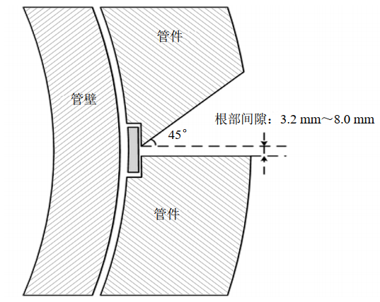 環(huán)焊縫根部的倒角為斜向45°;對610 mm管徑及以下,環(huán)焊縫組對間隙控制在3.2 mm以?xún),?60 mm管徑及以上的,組對間隙最大控制在6.4 mm[3],接頭設計如圖 2所示。