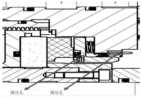 (2)改進(jìn)措施。通過(guò)對干氣密封推環(huán)結構進(jìn)行分析,發(fā)現推環(huán)密封圈與安裝槽之間存在密閉空間(圖 4)。當停機放空時(shí),密閉空間留存的氣體發(fā)生反竄,長(cháng)期使用過(guò)程中將密封圈C環(huán)擠出安裝槽,進(jìn)而造成推環(huán)的卡滯。通過(guò)改造,在推環(huán)密封圈安裝槽底部加工8個(gè)泄壓孔,及時(shí)將密封圈滲漏的氣體排出,確保不再產(chǎn)生反壓(圖 5)。