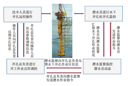 與此同時(shí),潛水人員潛入水下輔助及監控開(kāi)孔機作業(yè),潛水監督在潛水控制室通過(guò)實(shí)時(shí)監控系統與潛水員保持溝通并指揮潛水人員作業(yè)。潛水監督與開(kāi)孔總負責實(shí)時(shí)對接并接收作業(yè)指令和發(fā)送作業(yè)指令,同時(shí)監控潛水人員動(dòng)態(tài)。開(kāi)孔作業(yè)流程及管控如圖 2所示。