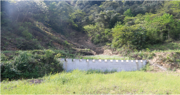 工程實(shí)例:某管道平行等高線(xiàn)沿坡體中部臺田地敷設,2020年暴雨期間上部斜坡發(fā)生高位淺層滑坡,大量水流夾雜塊石順溝而下,管道上部已建擋墻被沖刷破壞造成整體垮塌。隨后采取修建抗滑擋墻方式治理(圖 2)。