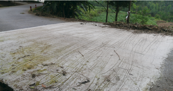 工程實(shí)例:某處管道垂直穿越鄉村水泥路下坡,路基下邊坡坡度較緩,現狀基本穩定,上邊坡已建擋墻結構基本完好,在路基內側形成了明顯的沉降洼地,長(cháng)4 m,寬 1.2 m,沉降高度2 m~5 m,沉降位置恰好在管頂附近,管頂埋深1.5 m,繼續沉降可能會(huì )引發(fā)管道變形。經(jīng)與路政部門(mén)協(xié)調對沉降段路基重新回填壓實(shí),公路沉降路面采用鋼筋砼 C25 重建(圖 7)。