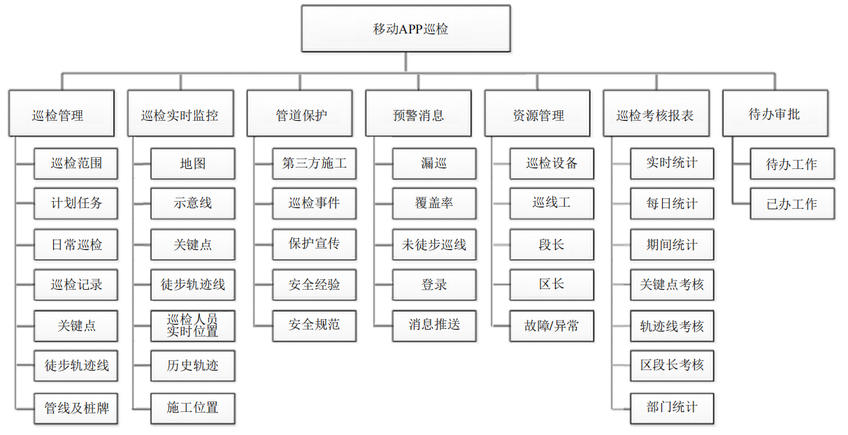 如圖 1所示,移動(dòng)APP巡檢系統包含諸多功能,利用物聯(lián)網(wǎng)技術(shù)可將巡檢異常情況、巡檢事件上報信息等及時(shí)推送給管理人員,使其能夠隨時(shí)隨地了解管道現場(chǎng)及巡檢情況。同時(shí)逐步積累巡檢信息及管道事件數據,為智能管道大數據分析儲備基礎數據[5]。