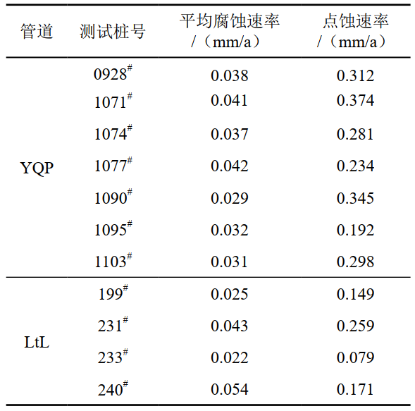 油氣管道大多埋于地下,因環(huán)境因素較為復雜,容易發(fā)生腐蝕,因此管道防腐是保障管道安全運營(yíng)的重要措施[1-3]。目前我國埋地管道均采用防腐層與陰極保護聯(lián)合防腐[4-6]。為了評估管道陰極保護有效性,選取YQP管道0928#—1103#測試樁管段(管段1)和LtL管道0199#—0240#測試樁管段(管段2)進(jìn)行實(shí)驗,現場(chǎng)選擇不同測試樁位置埋設試樣,測試各處陰極保護電位、自腐蝕試樣以及陰極保護試樣的腐蝕速率。