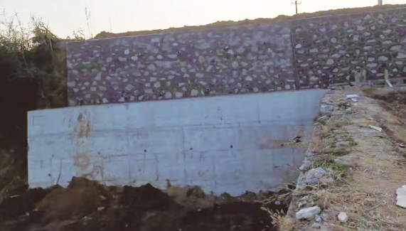 擋土墻是臺田地最常用工程防治措施,可根據現場(chǎng)情況采取混凝土擋墻、漿砌石擋墻與干砌石擋墻或其組合的防護形式(圖 4、圖 5)。針對臺田地覆土層較為松軟地帶,可在原防護基礎之上,修建漿砌石或混凝土排水渠與消力池相結合的方式排放雨水,防止地基下沉、坍塌。
