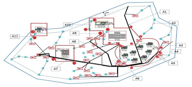 油田集輸油管道大部分呈現為支狀、網(wǎng)狀結構,高后果區識別難度較大,通過(guò)實(shí)踐總結,形成了符合油氣田特點(diǎn)的區域識別法(圖 4)。根據管網(wǎng)年代、環(huán)境、介質(zhì)、管材等主要風(fēng)險因素,以平滑曲線(xiàn)連接邊界,將邊界線(xiàn)以平行趨勢向外延伸200 m,以延伸后的邊界線(xiàn)包含區域作為一個(gè)識別單位,統計管網(wǎng)單元內的特定場(chǎng)所、易燃易爆場(chǎng)所、人口密集區及該場(chǎng)所200 m范圍內包含的管道或管段,此管道或管段即為高后果區管道。
