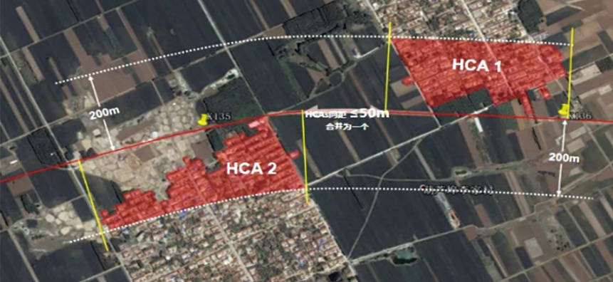 GB 32167對高后果區拆分未進(jìn)行規定。油區居民區集中,交通道路發(fā)達,工業(yè)區不斷延伸,河流水系多,連續高后果區長(cháng)度較長(cháng),一般以2 km左右拆分為一個(gè)高后果區。拆分時(shí)考慮居民區、交通要道、環(huán)境敏感區分類(lèi),若全部是同一類(lèi),則按照2 km左右范圍選擇道路、田坎等作為分界點(diǎn)。