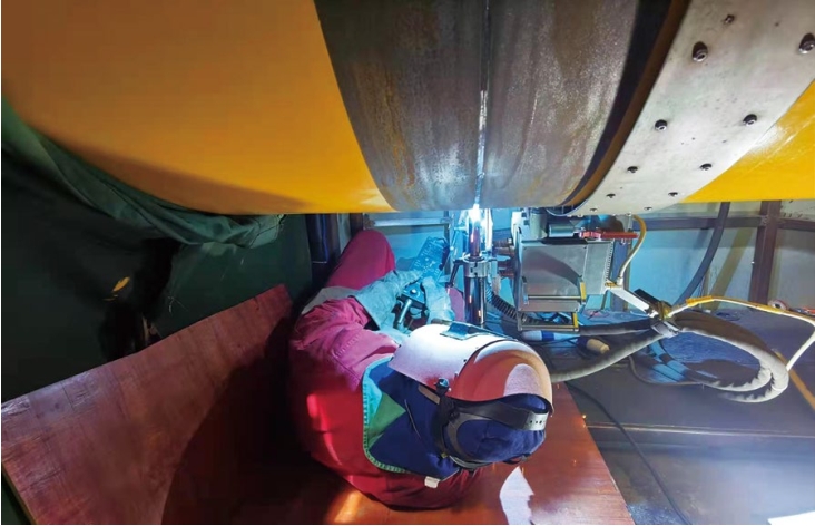 (1)自動(dòng)焊工藝。如此壁厚的高鋼級、大口徑補償彎采用自動(dòng)焊接在國內尚屬首次,沒(méi)有類(lèi)似焊接經(jīng)驗借鑒。項目小組與國家焊接試驗室、自動(dòng)焊廠(chǎng)商等單位多次交流和反復試焊,分析焊接缺陷發(fā)生位置、性質(zhì),克服由壁厚差導致的錯邊、CTOD難以達到要求、自動(dòng)焊軌道較難滿(mǎn)足焊縫端面垂直度要求、焊道層間未熔合等缺陷問(wèn)題,通過(guò)焊接工藝評定,形成符合要求的焊接工藝規程。自動(dòng)焊的應用不僅保證焊接質(zhì)量也大幅提高了焊接效率(圖 3)。