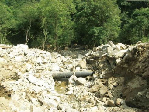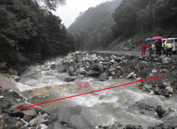 2010年7月,受連續大暴雨影響,關(guān)山溝泥石流爆發(fā),管道沿線(xiàn)水毀災害十分嚴重,許多地段公路邊溝破壞、護岸擋墻垮塌、過(guò)水路面不復存在,有600米管段多處受損。其中A穿越河流處,原采用護岸墻+圓管涵水工保護工程防護,管堤受板橋溝洪水垂直沖刷嚴重,洪水中夾帶有大量塊石造成管堤處原有圓管涵堵塞,塊石直接沖擊管道上方已形成寬約10米、深約5米的豁口,6米長(cháng)露管,表面防腐層局部破損(圖 1)。